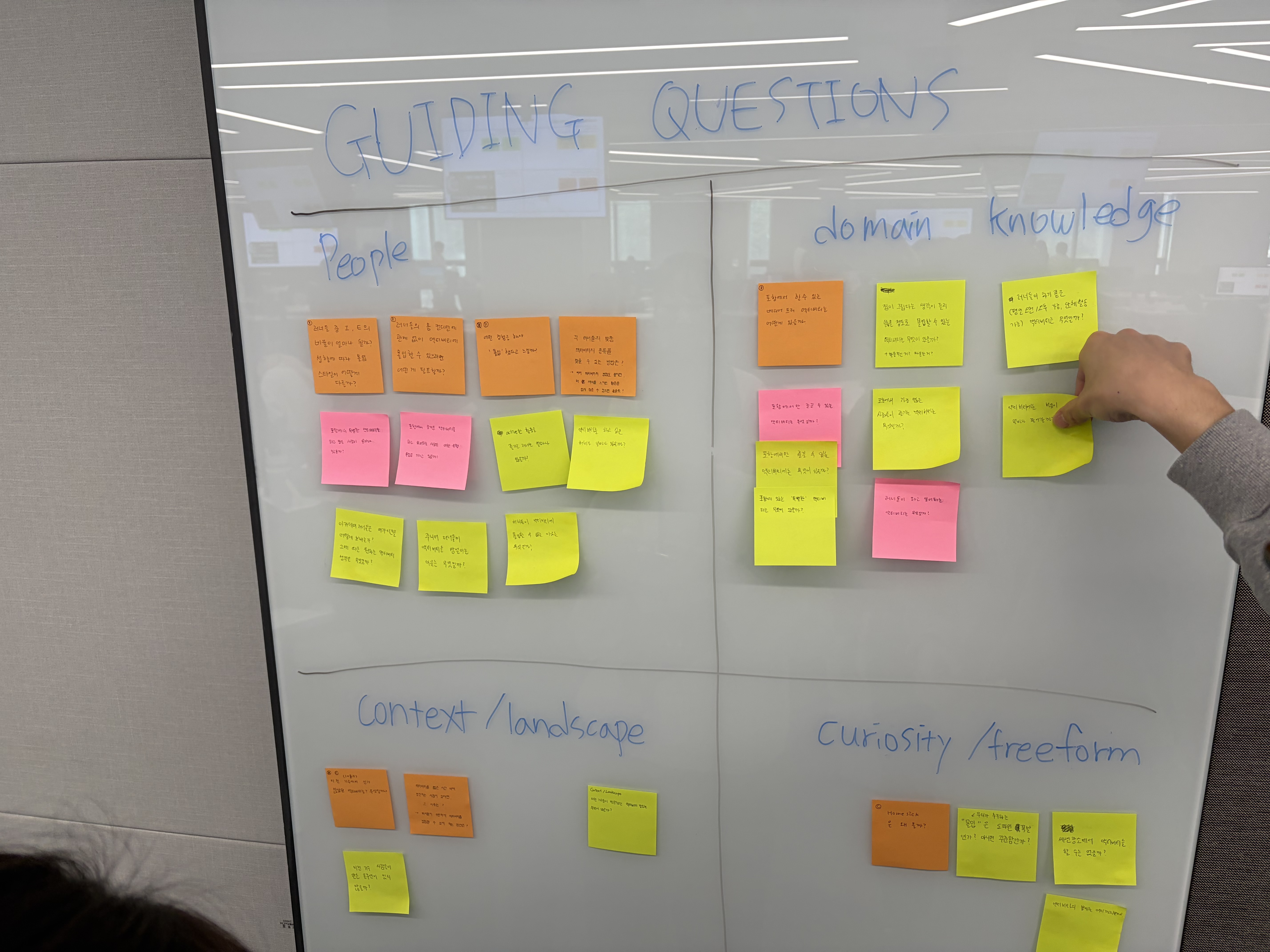 3/16부터 3주 간 첫 번째 챌린지인 Challeng1(C1)이 시작되었다. 적응 기간인 Prelude가 끝나고 처음으로 무언가 만들기 위한 팀이 처음으로 만들어졌다. 팀원은 총 6명이었다. 3주의 기간은1. Engage 1일2. Investigate 6일3. Act 2주 로 흘러가고 1주차는 Engage, Investigate를 하며 보냈다. Engage 💍대주제는 포항과 아카데미였고, 팀끼리 보여 생각나는 키워드를 포스트잇에 적어보았다. 우리 팀은 액티비티로 정하게 되었다. Investigate 🔬 Guiding Question를 만들기 위해 People : 우리 챌린지에 영향을 받는 사람, 단체, 커뮤니티를 더 자세히 알 수 있는 질문들domain knowledge : 우리 챌린지와 관..