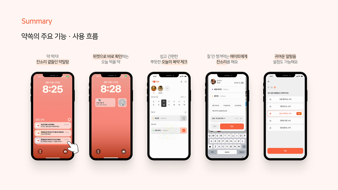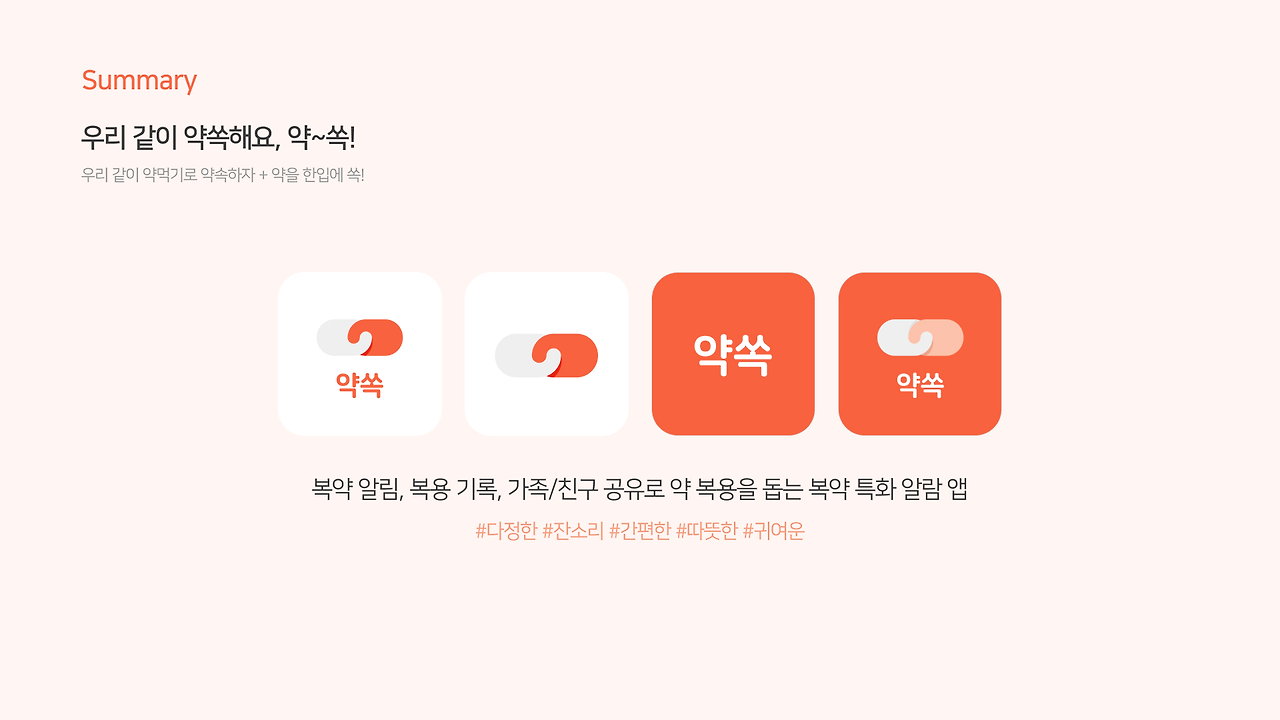 우리 팀(약쟁이들)이 만든 서비스는 서로 약 먹었는지 잔소리 해줄 수 있는 앱 약쏙이다. 기존 시장에는 개인이 복약을 관리하는 형식이 많은데,