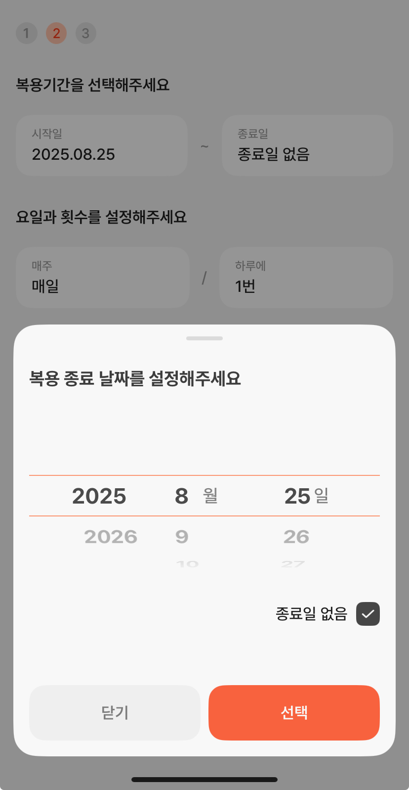 그중 고민을 많이 했던 요구사항은 종료일 없음 옵션이었다. 유저의 입장에서 복약 종료일 없음을 선택할 수 있다면 훨씬 편해질거라 예상했고 이 기능을 도입하기 위해 미래의 스케줄은 DB에 insert하지 않고 dto로 보여주는 on the fly 방식을 채택했다. 자세한 내용은 여기서 볼 수 있다.