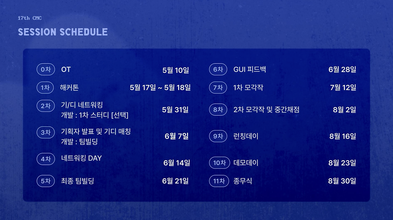 cmc 17기 활동은 다음과 같이 진행되었다. 서버 파트 챌린저들은 최종 팀빌딩 전에는 팀빌딩 세션이 없어서 스터디를 진행했다. 서비스 기획부터 출시까지 약 두달이 주어지며 개발 기간은 약 6주이다. cmc는 다른 동아리들과 다르게 각 파트 당 1명이고 ios, 안드로이드를 모든 팀이 출시해야 한다. 개발 기간도 짧아서 정말 만만치 않았다..